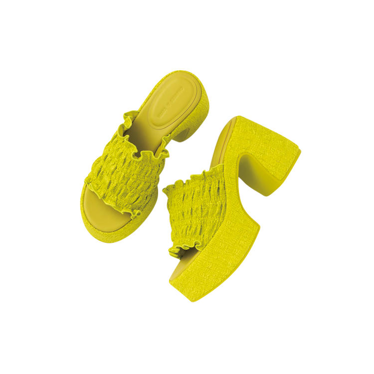 夏を感じさせる素材感で気分を高めて。厚底だからスタイルアップ効果も◎。