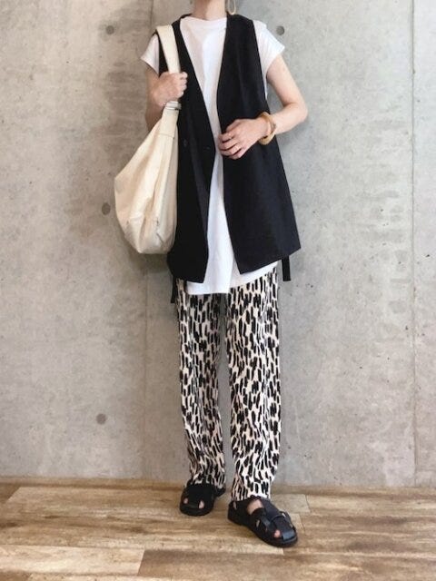 黒のベストをレイヤードさせてきちんと感をプラスし大人っぽくきれいめな雰囲気に。足元はグルカサンダルを合わせて抜け感も演出しましょう。
