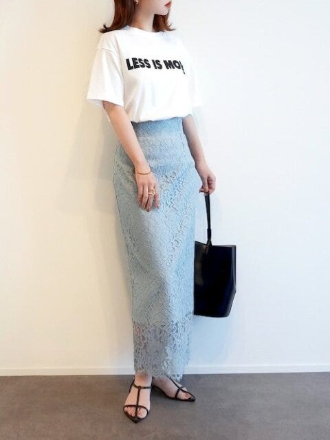 白のロゴTシャツ×ブルーのスカートで爽やかなコーデ。大人っぽく上品な印象を与えつつも、白Tシャツでカジュアルダウンさせて大人女性らしく余裕のあるスタイルに。
