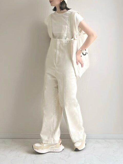 カジュアルになりがちなサロペットもフレンチスリーブの白Tシャツを合わせれば、きれいめカジュアルに。オールホワイトでまとめることで大人っぽく涼し気な印象に♪