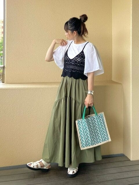 カーキのティアードスカートとも相性抜群でカジュアルながらもレディライクに。ビスチェと合わせればボリューミーな袖が強調され大人可愛いです。