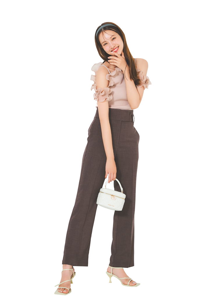 ピンクベージュプリーツフリルニット 12,540円/SNIDEL ブラウンパンツ 10,450円/LILLIAN CARAT(リリアン カラット) カチューシャ 880円/アネモネ(サンポークリエイト) 白バッグ 7,900円、白サンダル 7,500円/ともにチャールズ&キース(チャールズ&キース ジャパン) Item2 ブルーシアーシャツ