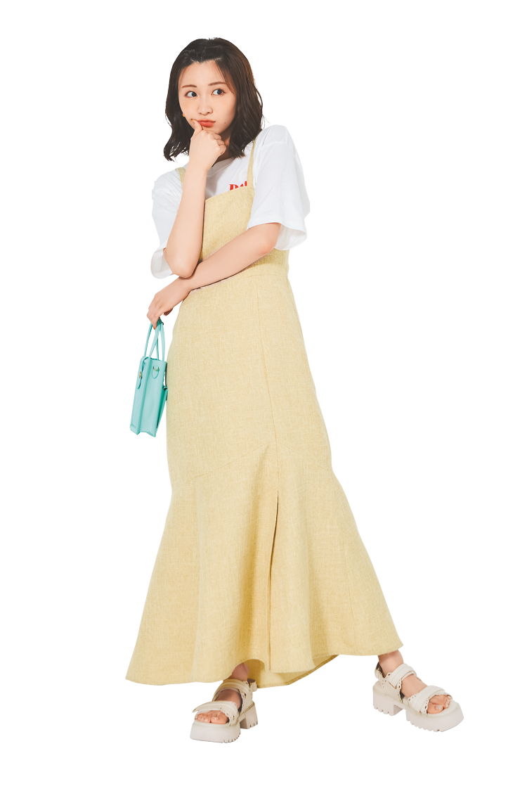移動が多い初日はらくちんワンピで。やせ見えな、ほっそりシルエットが◎。ワンピにTシャツをしのばせてガーリーカジュアル。