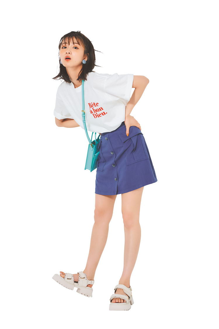 買い物ラストスパートな最終日は動きやすさ重視なTシャツ×ミニ。どんなに歩いても疲れないスポサンは旅コーデの定番!