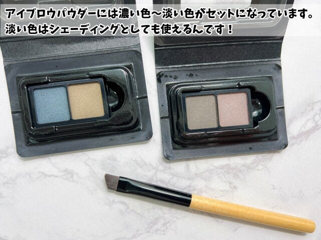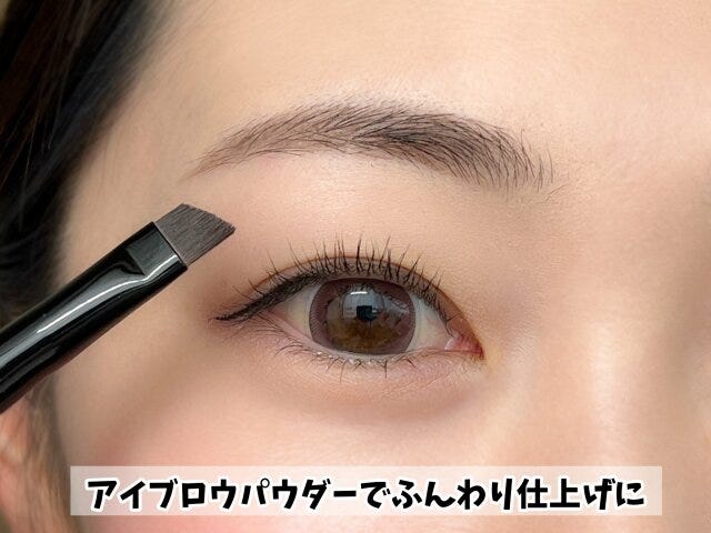 最後にブラシとアイブロウパウダーを使ってふんわりと仕上げていきます。眉頭から眉山は薄く、眉山から眉尻を濃くして立体感を出しつつ、のっぺり感のない眉に仕上げていきます。