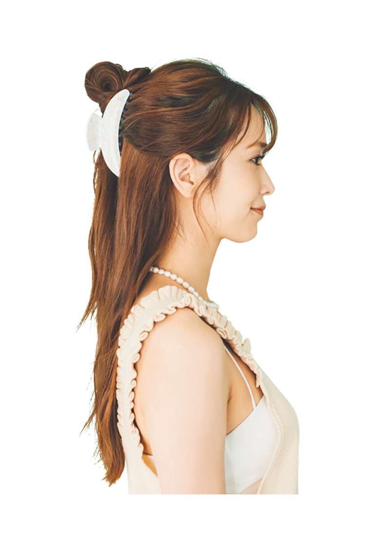 韓国でチッケピンと呼ばれるヘアクリップは、レトロなマーブル模様と丸みを帯びた形が人気。ゴムは使わず、チッケピンだけでつくるゆるアレンジにトライ!