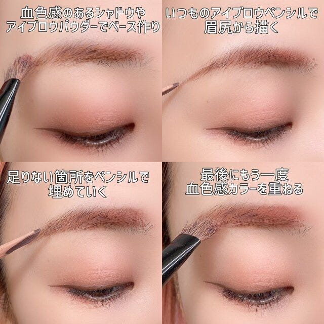 ポイントは眉を描く時のベースに血色感カラーを仕込んでおくこと。ベースに入れておくことで眉の色味が浮かずにナチュラルに仕上げることができます。