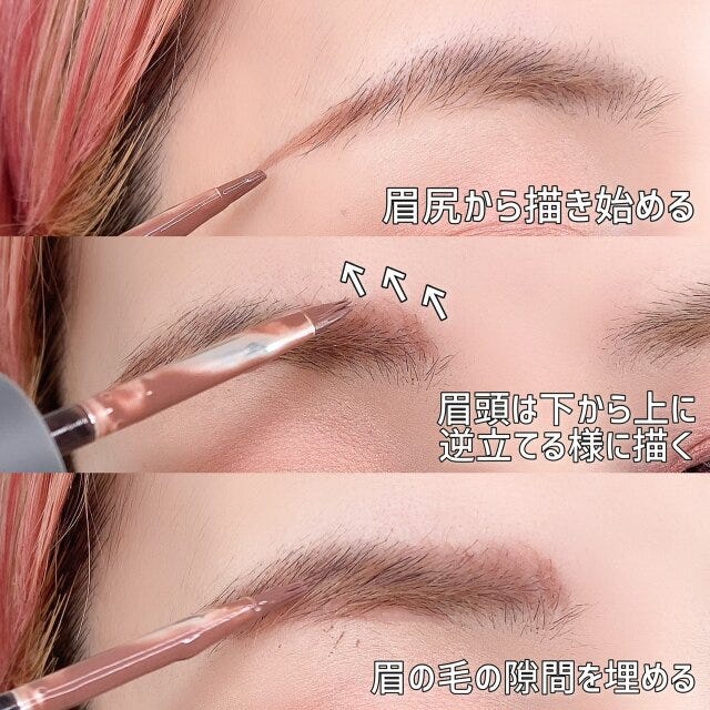 眉頭は下から上に向かって描くようにすると、今っぽ眉に仕上がります。