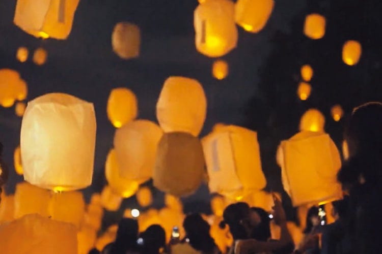 屋台や食事、占いなど催しを楽しんだ後は、ランタンを空にリリース!幻想的な夜空が楽しめます。