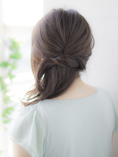 2.両サイドを何回かに分けながらねじりながらほぐして ぼんのくぼに集める