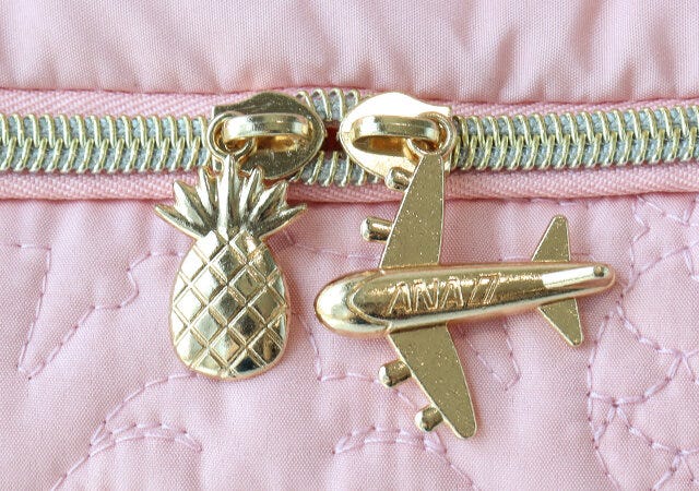 ファスナーには、パイナップルと飛行機のモチーフが!高級感のあるゴールドが映えて、とっても高見え!