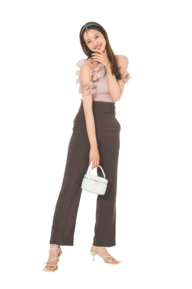 ピンクベージュプリーツフリルニット 12,540円/SNIDEL ブラウンパンツ 10,450円/LILLIAN CARAT(リリアン カラット) カチューシャ 880円/アネモネ(サンポークリエイト) 白バッグ 7,900円、白サンダル 7,500円/ともにチャールズ&キース(チャールズ&キース ジャパン) 撮影/遠藤優貴 スタイリング/稲葉有理奈(KIND) ヘア&メイク/megu(村瀬分)、RIKO(KIND・吉田、ナタリヤ分) モデル/吉田朱里、村瀬紗英(ともに本誌専属)、ナタリヤ 文/小田和希子