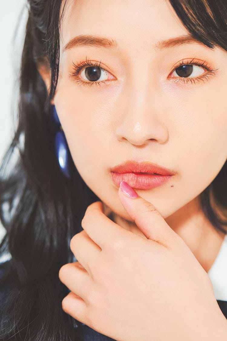 ネイビーメッシュトップスとスカートのセット 17,980円/Treat ürself イヤリング 8,100円/アビステ パープルバッグ 5,500円/アネモネ(サンポークリエイト) 白サンダル 9,900円/rienda(バロックジャパンリミテッド) Point マットリップで大人びさせる