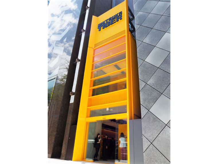 庄田良二オニツカタイガーカンパニー長は、「イエローコレクション初の店舗を銀座に構えたのは、この地が世界的に注目されているから。銀座の一番目立つところに、一番目立つ形で出すことにした。イエローは創業者の鬼塚喜八郎が好み、大切にしてきた色。黄色をいかにラグジュアリーに見せるかをテーマに、深みのある色みを選び、外装では年が経つとともに風合いを重ねるスタッコ仕上げを採用した」と話す。