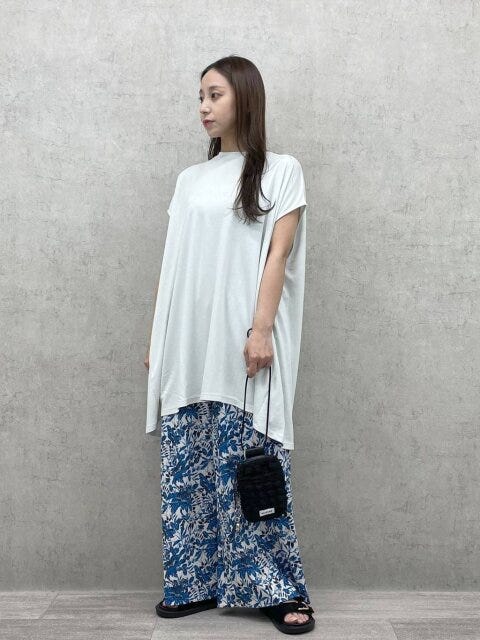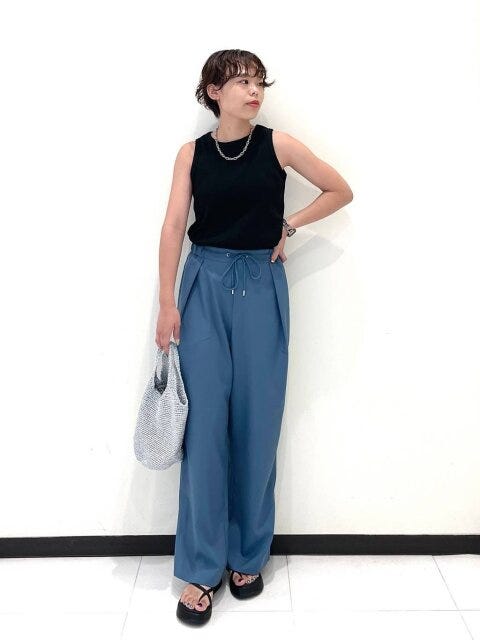 速乾機能付きドライタッチ素材で暑い日でも快適。直線的な肩のカッティングで二の腕をすっきり見せ、ワイドパンツで脚のラインをカバーしてくれますよ!