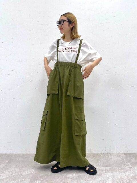 ミリタリーテイストで、肩ひじ張らずリラックスして着られるジャンパースカート。胸元位置ではきこむデザインで、カジュアルになりすぎないのがポイントです!