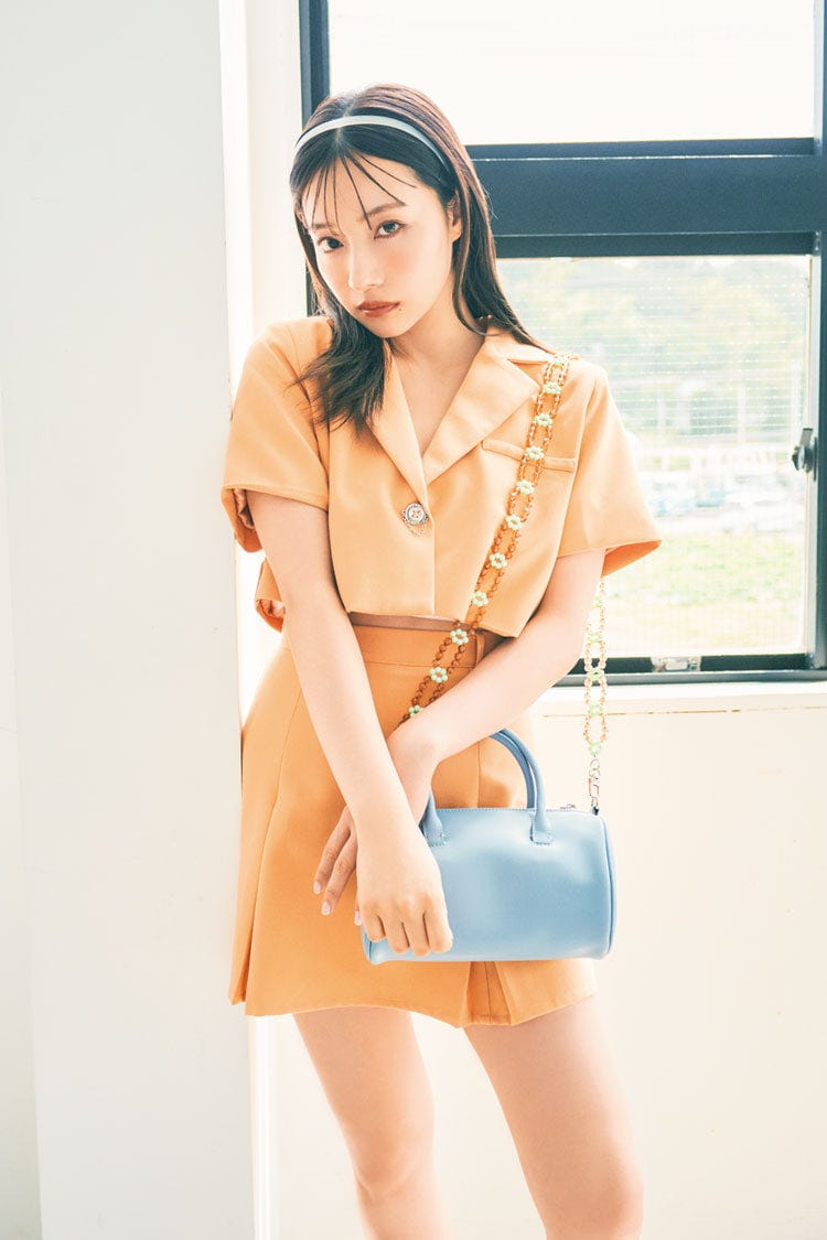 夏らしいオレンジのセットアップが主役のコーデ。スタイルアップが叶うショート丈ジャケット×ミニスカの組みあわせが今っぽ。カチューシャやバッグは涼しげなカラーのアイテムをチョイスして♡