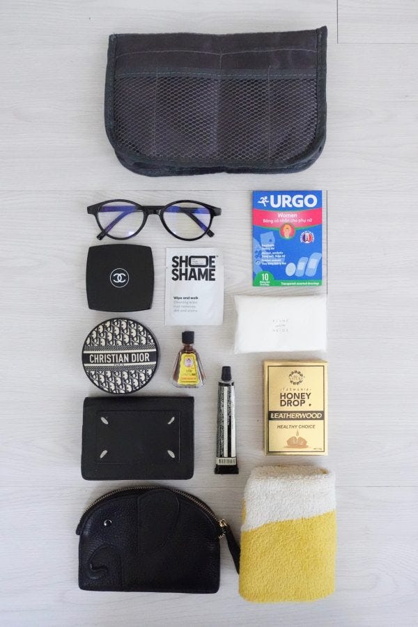 バッグの真ん中にはお財布・領収書ケース・のど飴・ハンカチと使用頻度の高いものをまとめました。ファスナー付きのポケットには何も入れていませんが、例えばパスポートや生理用品などを入れるといいですね。