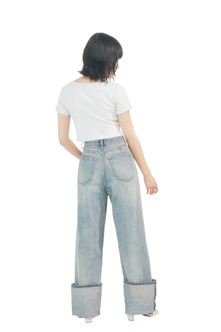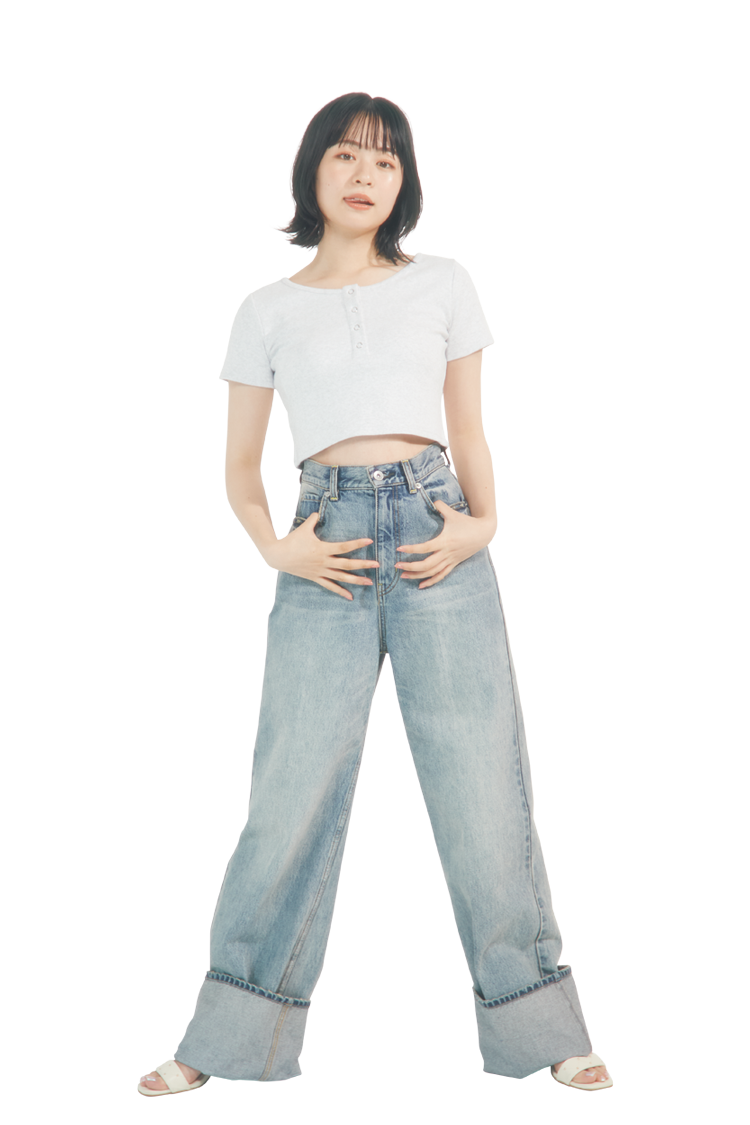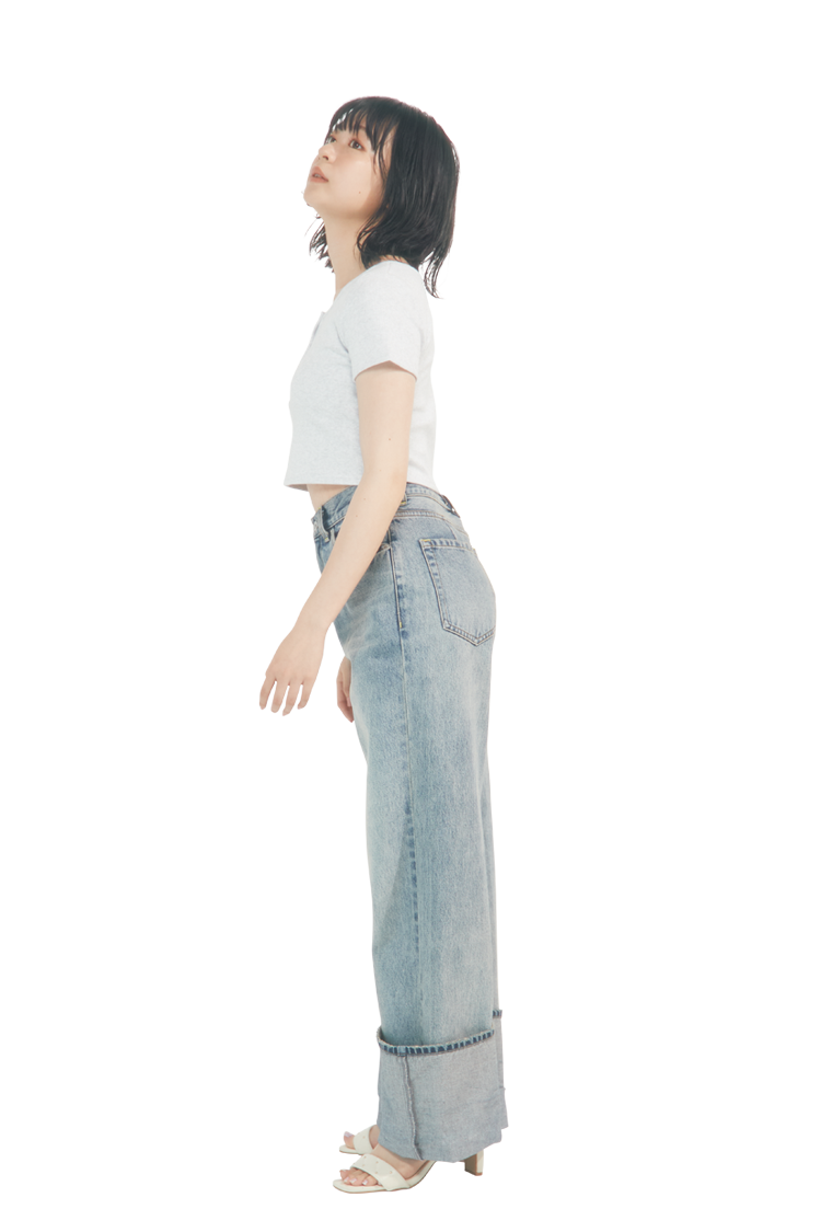 ワイドを選ぶときはウエストジャストが正解。太めのシルエットがはっきりと出て、ウエストをキュッと見せてくれる。 丈感はずるっと長めのアイテムを選ぶと、よりこなれた印象に。靴をはいた状態で床にギリギリつかない長さを選んでみて。 後ろのポケットがおしりの高めの位置にくるかどうかをチェック!ヒップの位置を高く見せて目線を上にあげよう。