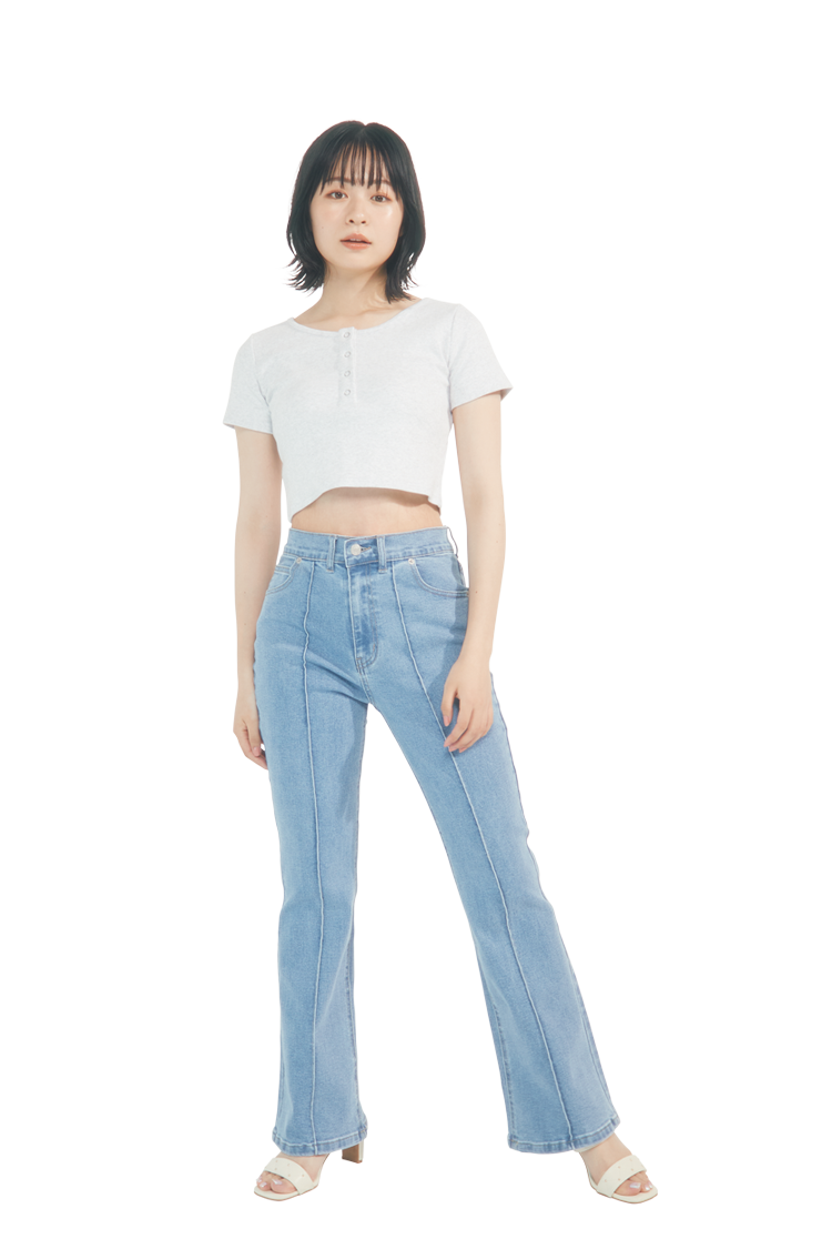 ラインの出やすいフレアーは、ハイウエストを選ぶのがポイント。ウエスト位置を上げることで脚長効果を狙えちゃう♡ ひざ部分が細く、フレアーは広めのものを選んで。メリハリが強くはっきりと出たほうが細見えするし、こなれ感もゲット! 長くはき続けるには、はき心地も重要。動きやすいストレッチ性があるものを選べば、たくさん動く日でもストレスフリー。