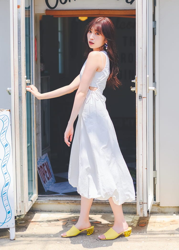 王道白ワンピを使ったコーデ。ウエストのカットデザインが抜け感を演出してくれます。足元には夏らしいイエローサンダルを選んで爽やかな印象に。大きめのアクセサリーをあわせれば、顔まわりが華やかな印象に仕上がります♡