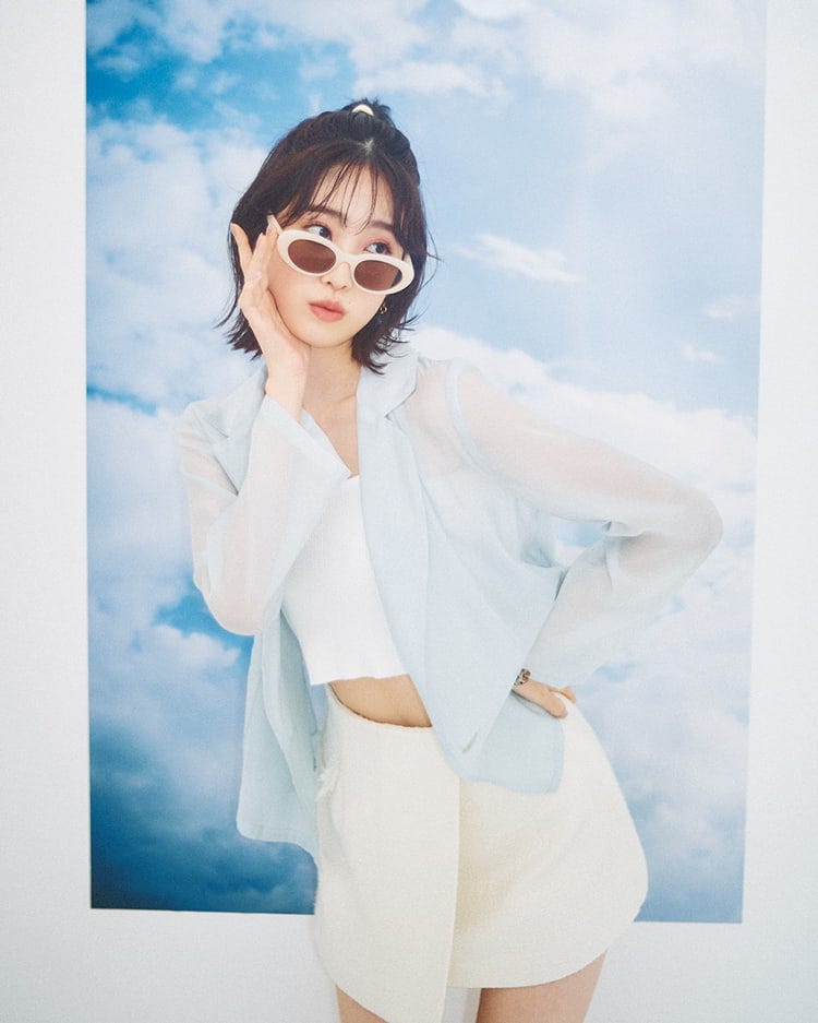 ライトブルーシアーシャツ 16,500円、白ツイードスカート 17,600円/ともにeimy istoire LUMINE EST新宿店 白リブニットビスチエ 1,649円/WEGO サングラス 6,490円/COCO DEAL(ココ ディール) イヤリング 12,600円/アビステ Item3 チュールビスチエ