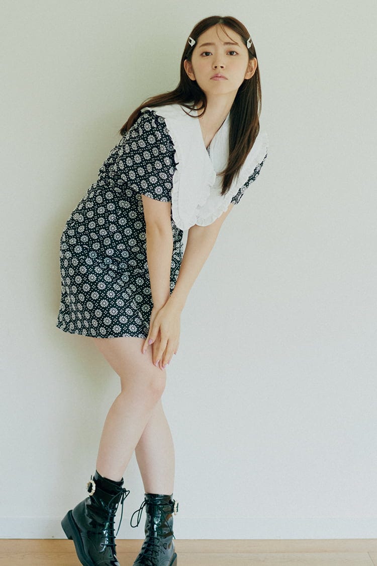 ヨーロッパのレトロシネマから飛び出した主人公のような、クセのある甘いワンピをご指名。あえてのカラーレスでしゃれ感たっぷりに。
