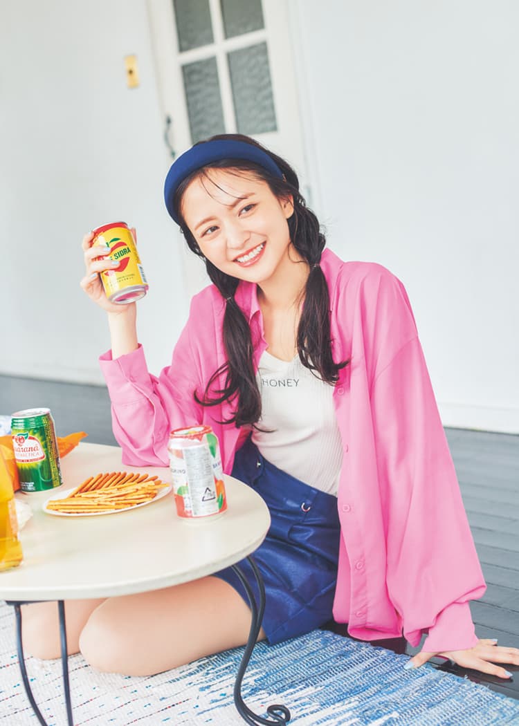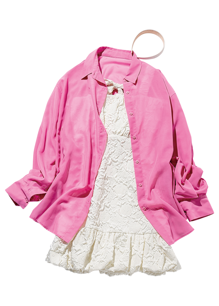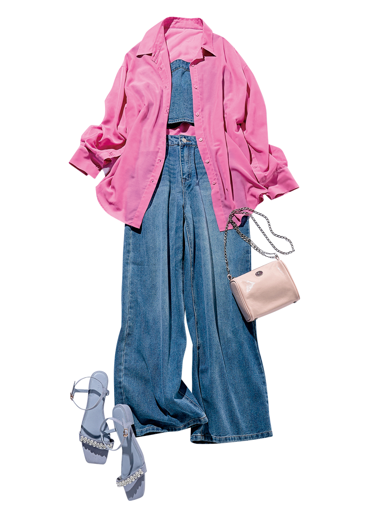 ピンクシャツは着回し。ビスチエつきデニム 3,299円/GRL ピンクチェーンバッグ 39,100円/minitmute(スクリーンショット) ブルーサンダル 7,920円/RANDA 撮影/女鹿成二(モデル)、上田祐輝(静物) スタイリング/稲葉有理奈(KIND) ヘア&メイク/サイオチアキ(Lila) モデル/金川紗耶(本誌専属) 文/柿沼奈々子