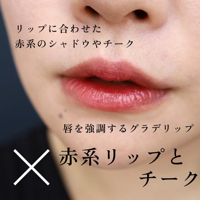 リップはグラデやマットを避け、ぷるっとしたツヤ感のあるシンプルカラーがおすすめです。