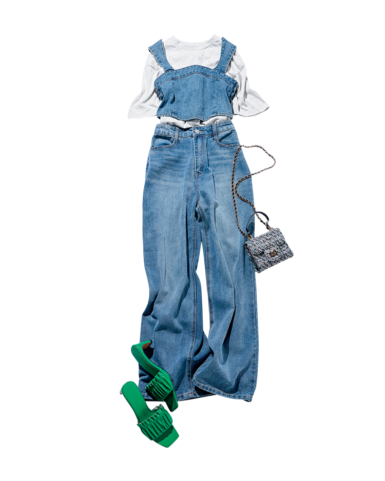 ロゴTシャツ 1,399円、ビスチエつきデニム 3,299円/ともにGRL ツイードチェーンショルダーバッグ 2,790円/神戸レタス グリーンサンダル 11,000円/RANDA Scene5 明日に向けて荷づくり。薄着で気分はもう海♪