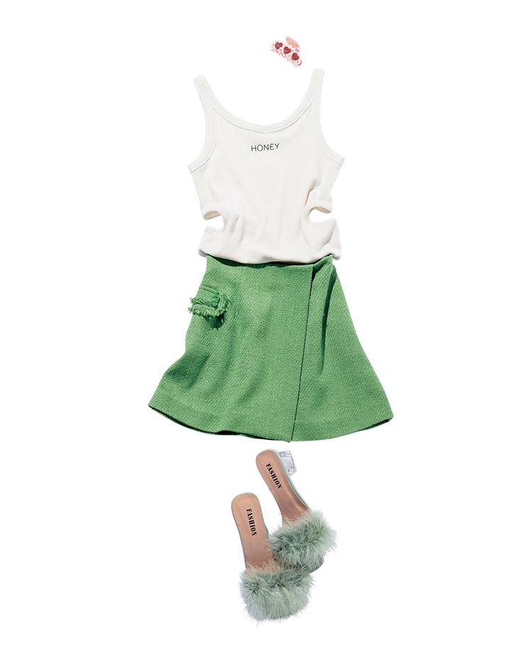 リブタンクトップ 12,100円/HONEY MI HONEY グリーンミニスカート 17,600円/eimy istoire LUMINE EST新宿店 ヘアクリップ 1,800円/Aura グリーンファーサンダル 4,700円/MORE self LOVE 撮影/女鹿成二(モデル)、上田祐輝(静物) スタイリング/稲葉有理奈(KIND) ヘア&メイク/サイオチアキ(Lila) モデル/金川紗耶(本誌専属) 文/柿沼奈々子