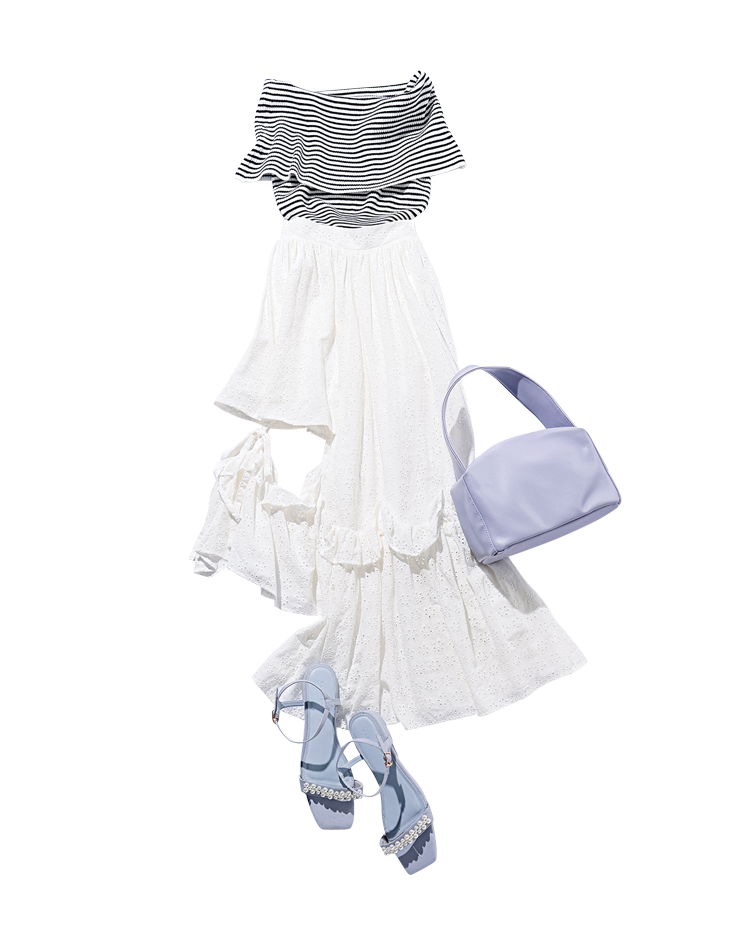 ボーダートップス 9,900円/SNIDEL アシンメトリースカート 17,380円/lilLilly(lilLilly TOKYO)パープルバッグ 5,800円/Olu. ブルーサンダル 7,920円/RANDA Scene4 バイトで注文を間違えてクレーム!