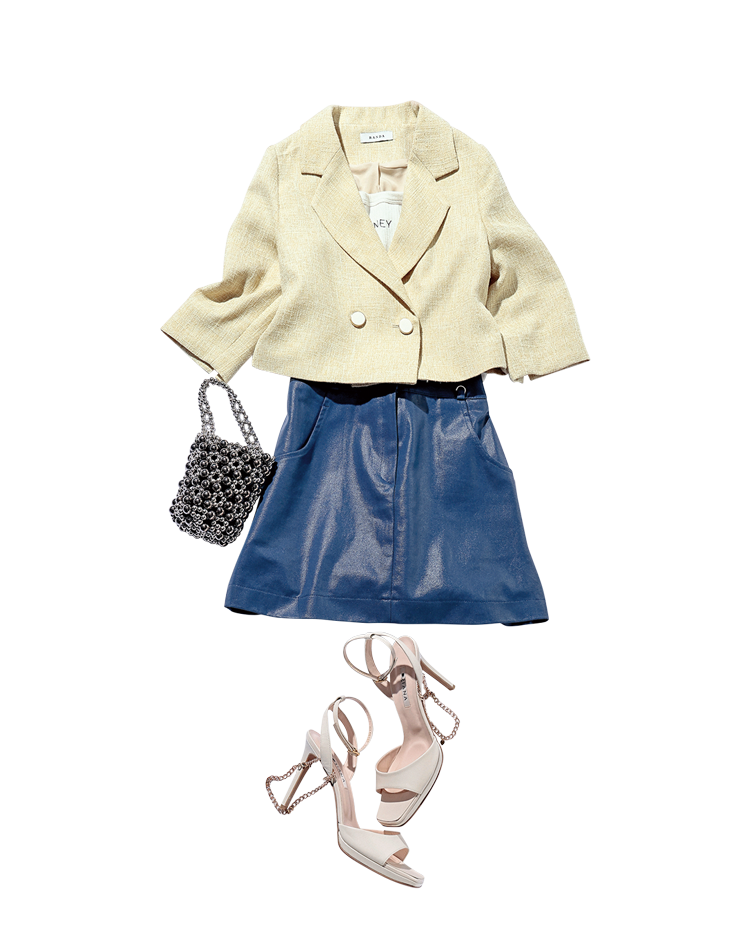イエローセットアップ(ジャケットのみ使用) 各14,960円/RANDA リブタンクトップ 12,100円/HONEY MI HONEY 台形ミニスカート 4,399円/Figments シルバーパールバッグ 5,980円/Treat ürself 白アンクルストラップサンダル 19,250円/ダイアナ(ダイアナ 銀座本店) Scene3 美容院中にLINEの通知が