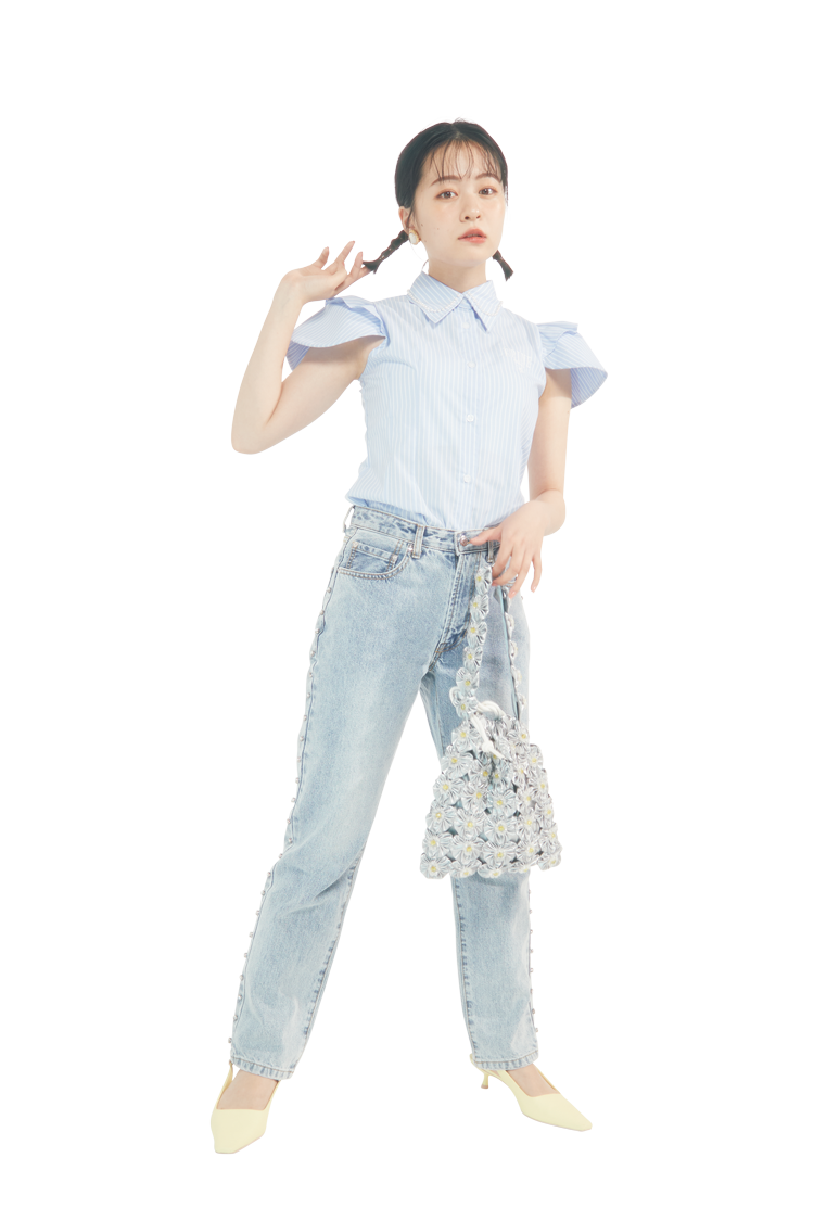 えりつきブラウス×淡色デニムでいいコちゃん風。爽やかなカラーでまとめたコーデもデニムでカジュアルダウン。