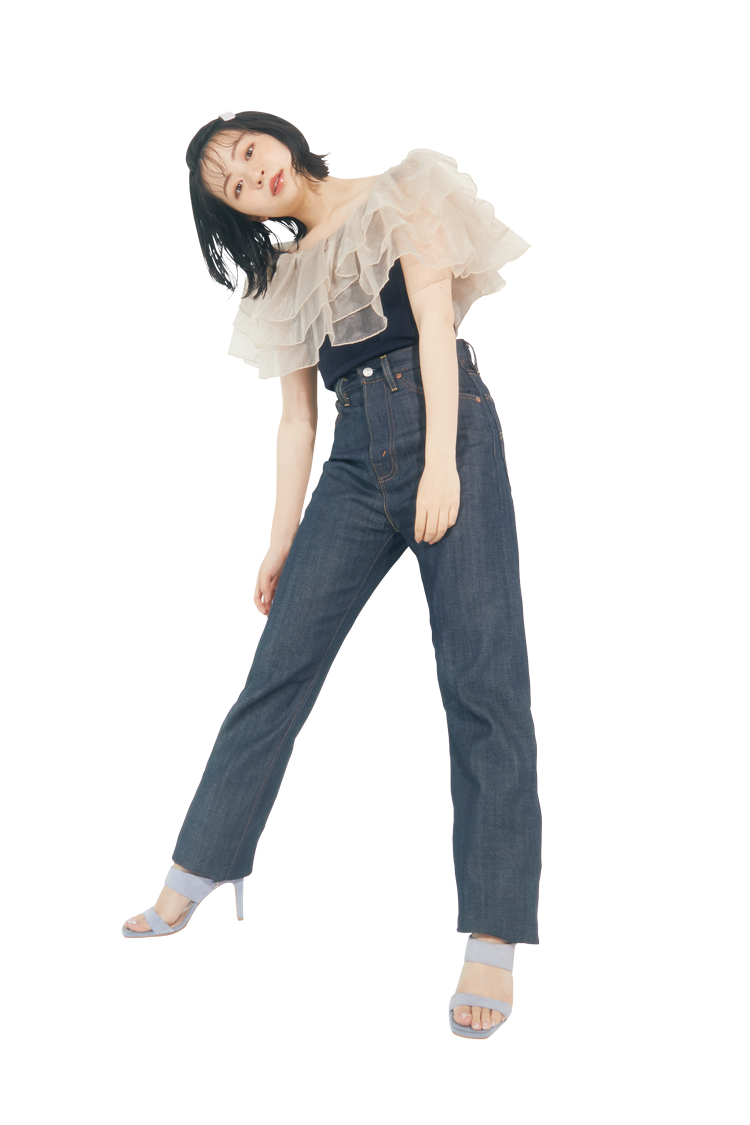 デコラトップスはハンサムデニムで締める。ハイウエストなデザインで脚長効果も♡
