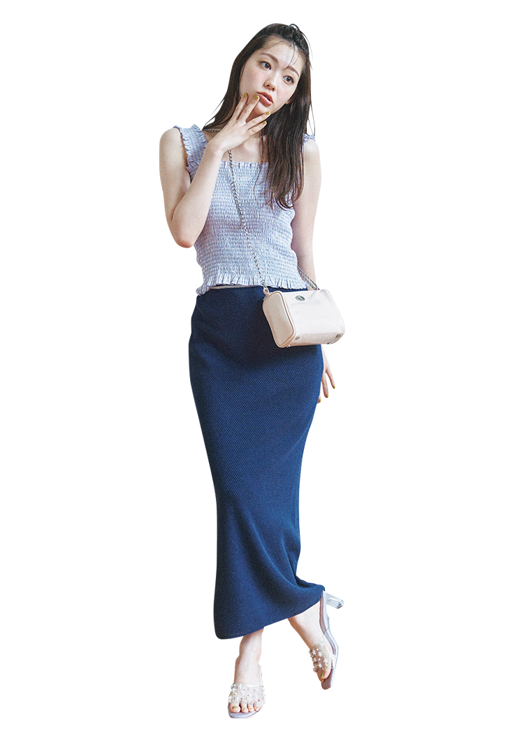 ぎゃるみなタンクにタイトロングで女み増し♡ 露出度の低いロングスカートをあわせて、バランスの取れた肌見せを。