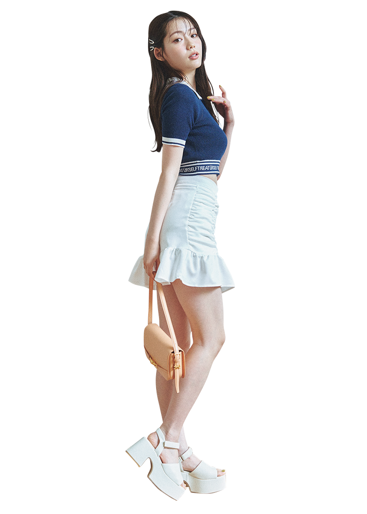 Item ネイビーメッシュトップスとスカートのセット おなか見せがセットアップなら即こなれ♡ ウエストまわりのロゴデザインがコーデのアクセントに。 ネイビーメッシュトップスとスカートのセット 17,980円/Treat ürself イヤリング 15,120円/アビステ グリーンリボンベルトミュールパンプス 8,910円/RANDA スタイリスト 城田さんが解説♡ セットアップで悩みがちな単品使いの
