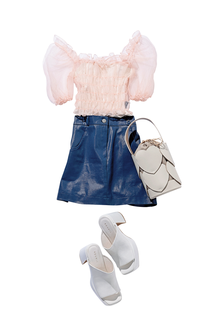 ブラウスは着回し。台形ミニスカート 4,399円/Figments アイボリーバケットバッグ 8,470円/キャセリーニ 白サンダル 11,000円/rienda(バロックジャパンリミテッド) Coordinate2 小物をピンクで揃えたコーデ