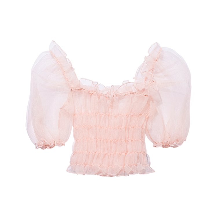 パフスリーブの透け感が◎。淡い色みとたっぷりフリルでガーリー気分が高まる!