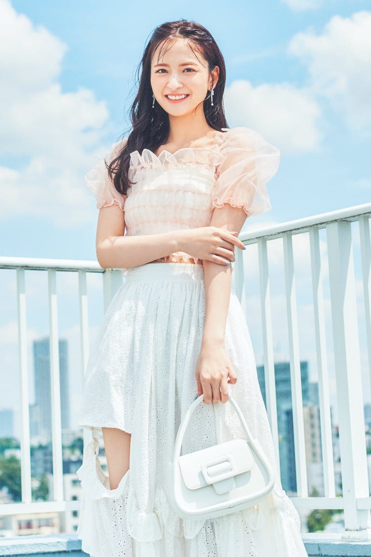 ブラウスは着回し。アシンメトリースカート 17,380円/lilLilly(lilLilly TOKYO) イヤリング 3,630円/Phoebe 白バッグ 7,480円/レイ ビームス(レイ ビームス 新宿) 撮影/女鹿成二(モデル)、上田祐輝(静物) スタイリング/稲葉有理奈(KIND) ヘア&メイク/サイオチアキ(Lila) モデル/金川紗耶(本誌専属) 文/柿沼奈々子