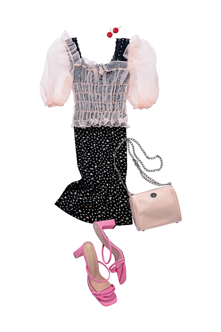 小物や花柄をピンクで揃えて女のコっぽさ全開に♡ ピタッとシルエットで大人見え確定。
