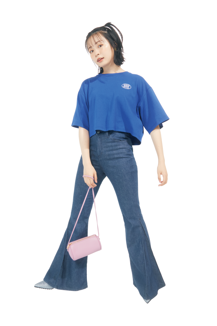 ブルーサイドタックフレアーデニムパンツ 25,000円/NORMA JEANS BLU ブルーロゴTシャツ 2,199円/WEGO イヤリング 19,800円/アビステ ピンクバッグ 2,310円/神戸レタス ブルーグリッターパンプス(9月発売予定) 11,000円/rienda(バロックジャパンリミテッド) Coordinate2 肌見せコーデ