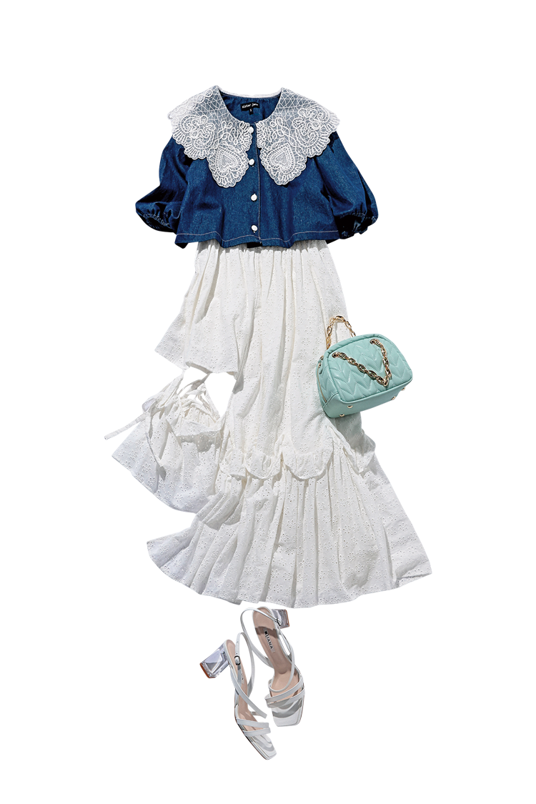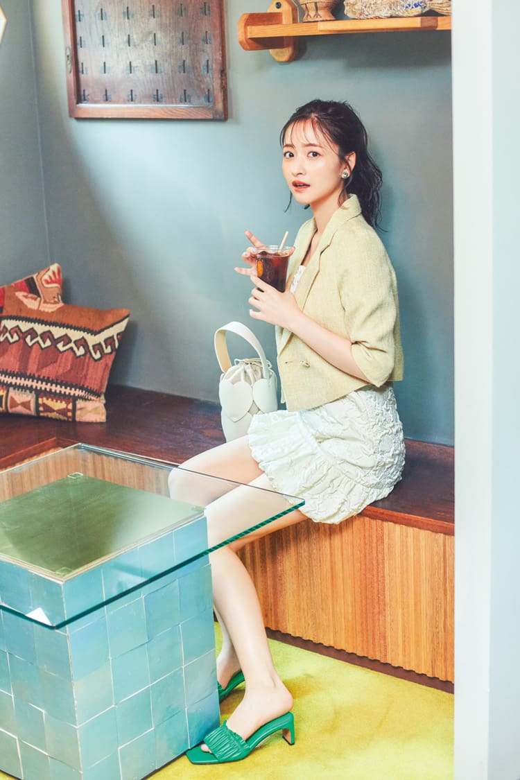 BIGえりジャケット 15,180円/SISTER JANE(ザ・ウォール ショールーム) アシンメトリースカート 17,380円/lilLilly(lilLilly TOKYO) ミントグリーンバッグ 17,050円、クリアヒール白サンダル 18,700円/ともにダイアナ(ダイアナ 銀座本店) Scene5 え、先輩が女の人と一緒にいる……?