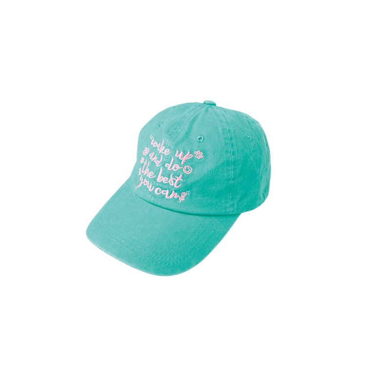 夏の日差しに映えるグリーンキャップ。カジュアルなキャップもピンクの刺しゅうで甘さをひとさじ。