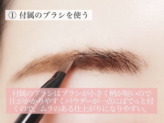 付属のブラシはパレットに入るサイズで作られているので、ブラシ部分が小さく柄が短いものが多いですよね。これでパウダーをアイブロウにのせようとすると、ブラシの先端に圧がかかりやすくなり、一ヶ所にぼてっとパウダーが付きやすくなります。