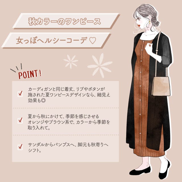 秋カラーのワンピース 女っぽヘルシーコーデ