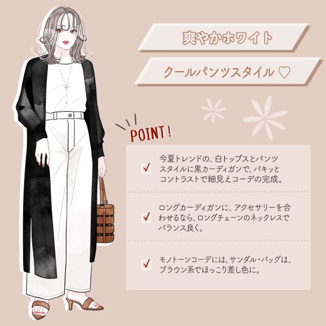 ・今夏トレンドの白トップスとパンツスタイルに黒カーディガンで、パキッとコントラストで細見えコーデの完成。
