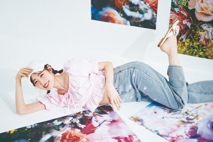 ピンクブラウス 6,580円/Treat ürself ハート柄デニムパンツ 5,600円/MORE self LOVE キャップ 5,400円/TYPESERVICE(MUSINSA JAPAN) 白リボンフラットサンダル7,920円/RANDA Check!2 太ももを肌見せ♡