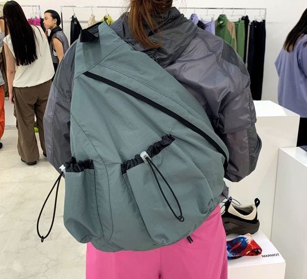 Tシャツ(9000円)は、マーモット・キャピタルのディレクターを務める菊乃さんの知人であるアーティストによる、花と人の顔をモチーフにしたグラフィックを配した。花柄をプリントしたショーツもある。スリングバッグも作った。大ぶりなサイズで、肩から斜め掛けでき、傘やボトルが入るドローコード付きポケットが二つあり、メインコンパートメントにはA4のノートパソコンを収納できるスペースも作った。