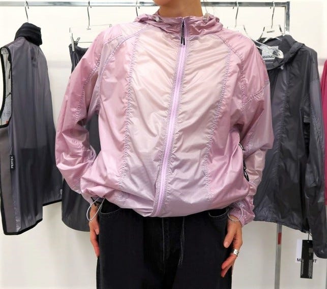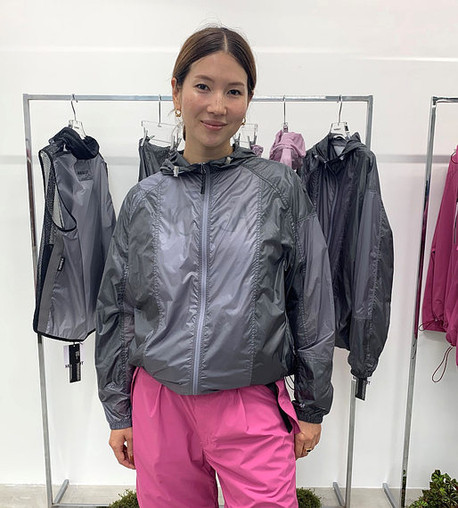 シェルジャケット(2万4000円)はパープルとピンクの生地をはぎ合わせてあり、あえて透ける素材を使った。中に着たトップの色と重なって見えることで、着る人によって異なるニュアンスを楽しむことができる。ブラウジング用のドローコードのトグルにも透明パーツを使った。同素材のスカート(2万1000円)も企画した。